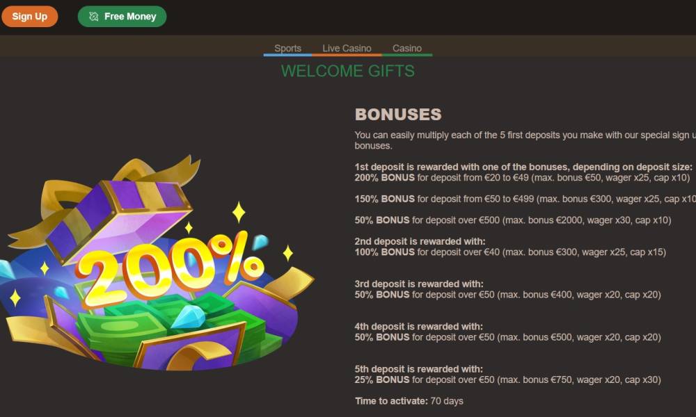 The bonus for the second deposit, as well as other gifts from the welcome package, can be activated within 70 days, and the wagering period is 72 hours.