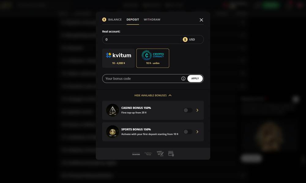 Popular payment methods are accepted: bank cards, e-wallets, cryptocurrencies and others. For a full list, see the cashier's checkout on the website.