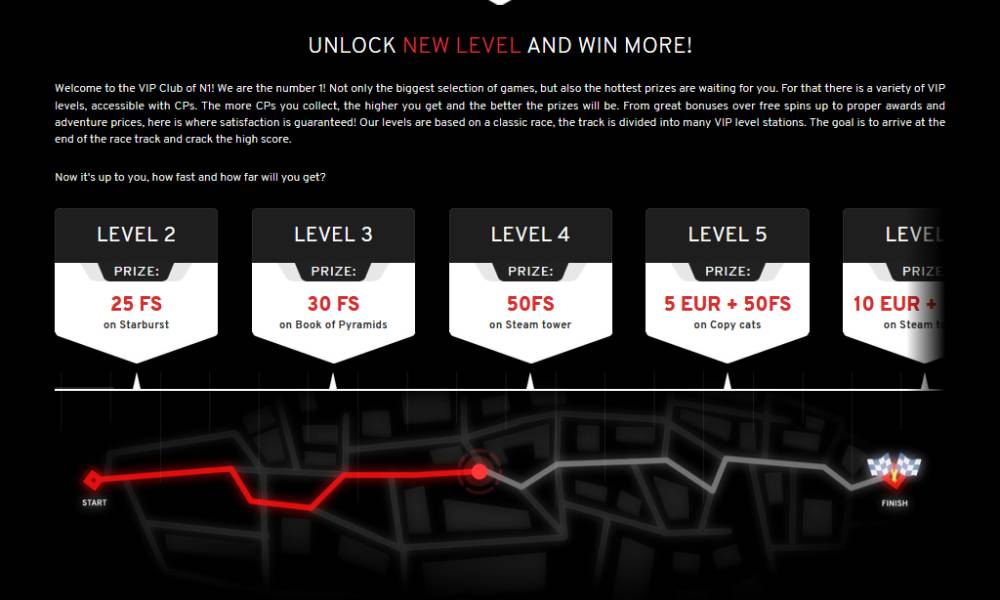The loyalty program at N1 Casino is called Road to Glory and offers various bonuses and privileges to players for their active gaming activity. Participants can earn comp points and progress through levels, receiving increasingly more rewards.