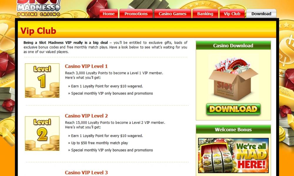 To get a welcome bonus of 400% up to 4000 dollars, the new customer of Slot Madness Casino have to install the casino software, register an account for the game for real money and make the first deposit up to 1000 dollars and fill a code WELCOME in a special window. The bonus should be turned over under the general conditions of the casino. Moreover, Slot Madness Casino has a loyalty program and other promotions: Happy Hour (a bonus of 150% for the deposits made in special time by Mondays), Terrific Tuesday (double loyalty points in blackjack by Tuesdays), Triple Treat (50 dollars free to those, who have made deposits on Monday, Tuesday and Wednsday) and etc. The full schedule of the events is available at the official website of the casino at Monthly Promotion page.