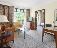 - Presidential Suite: The Presidential Suite, distinguished not only by area of 155 square meters, but also elegant interior, luxurious conditions for relaxation. The room has a bedroom, two rooms with balconies, library, dining area and equipped kitchen, private bath. The windows offer views of the garden. Guests have access to additional additional services: daily press delivery, butler service.