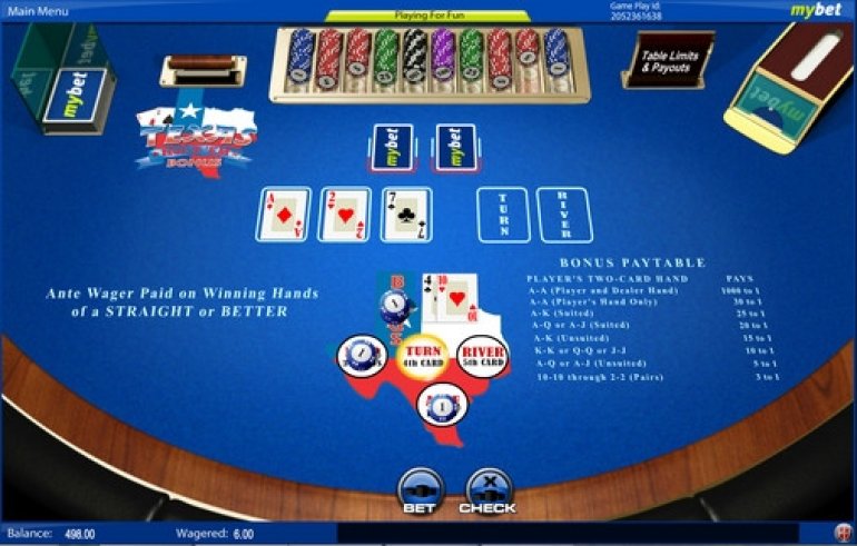 The customer makes an ante and receives two cards. The croupier deals three community cards if he or she calls and makes a bet. Then, you need to decide whether to raise or check. Such decisions should be made when the fourth and fifth cards are dealt. Bonus bets are not available.