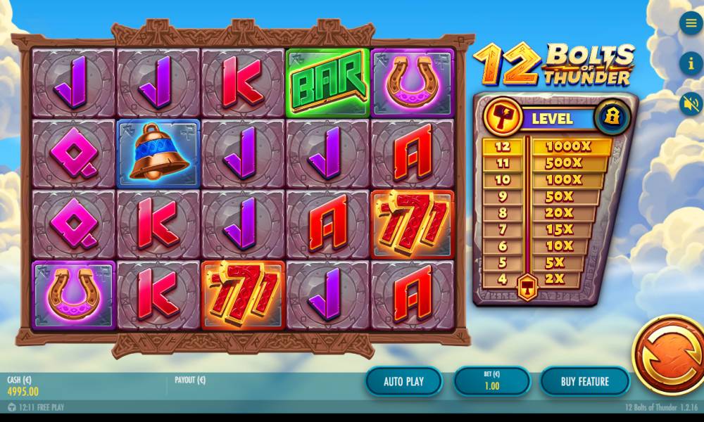 In 12 Bolts of Thunder, the playing field consists of 5 reels with 4 cells each and 20 Betways. Accounting for combinations starts from three symbols going from left to right (except for special ones). The maximum bet is 100 euros, and the largest available win is x30,000. The slot includes free spins with bonuses and its own Multipliers system.