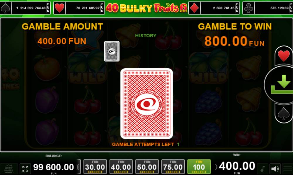 Players' adrenaline is maximized when chasing the big prize. The 40 Bulky Fruits 6 Reels online slot has something to fight for too. After all, there are four progressive jackpots. They correspond to card suits. How to win the jackpot? Turn over the cards one at a time until three of the same cards are found. The suit and will denote the prize. Its size is displayed above the reels. The good thing is that it is growing all the time, and stops and resets only at the moment of winning. This allows you to get large jackpots.