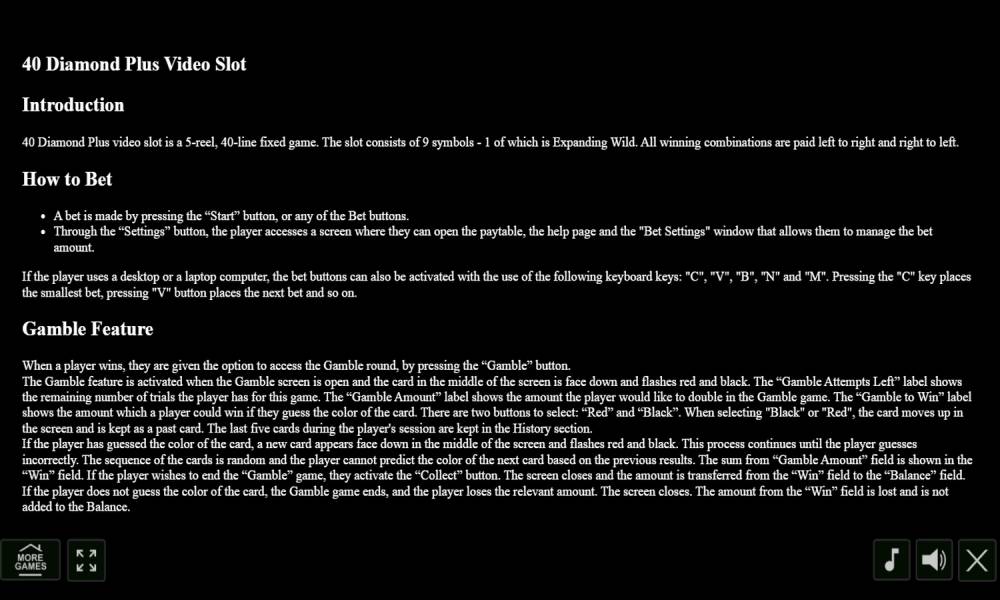 40 Diamond Plus online slot has 5 reels, with 4 rows of symbols in each. The payout mechanics are interesting - right to left and left to right from the outermost columns in a row on 40 fixed lines. Payment is made for chains consisting of 3-5 identical symbols. The game uses 4 types of higher and lower symbols each. There is also one special one, with which the bonus feature is associated. The developer has added its popular Gamble and Jackpot Cards rounds. The bet per spin players can bet in the range of 0.4-100 euros (equivalent in other currency). The maximum winnings are x1000 of the amount bet.
