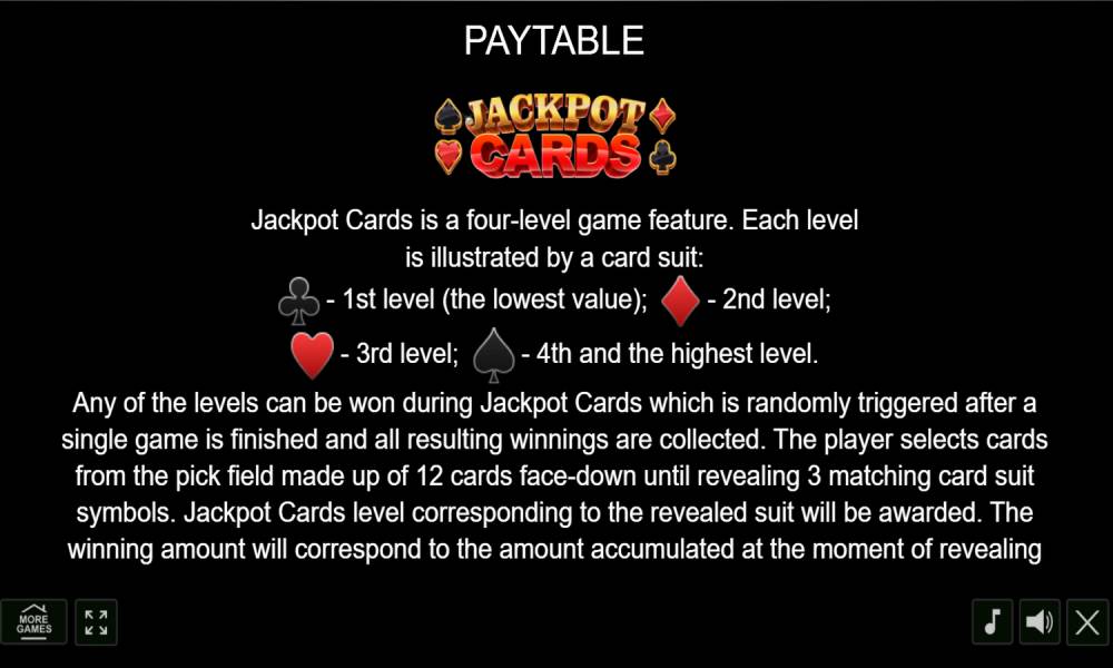 The jackpot round triggers itself at a random moment. Twelve cards appear on the field instead of the reels. They lie face up. The user must turn them over in any sequence. The game will end at the moment when three cards of the same suit are revealed. The prize will correspond to it - spades, hearts, diamonds or clubs (in descending order).