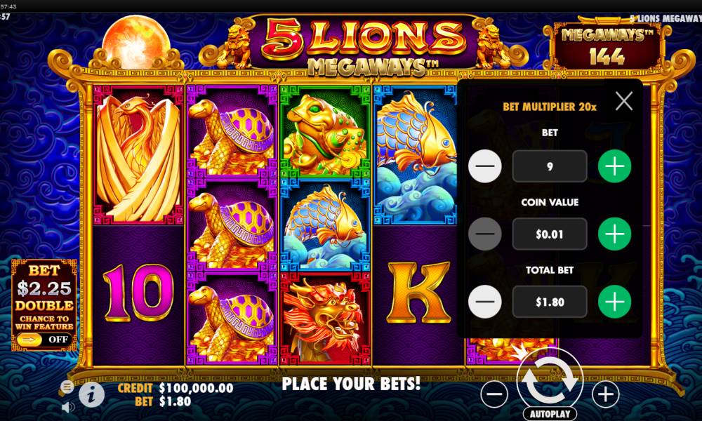 5 Lions Megaways slot machine from Pragmatic Play is dedicated to the Asian theme. If your luck smiles, you can win big prizes in this slot, up to 5,000 bets. The slot also has free spins.