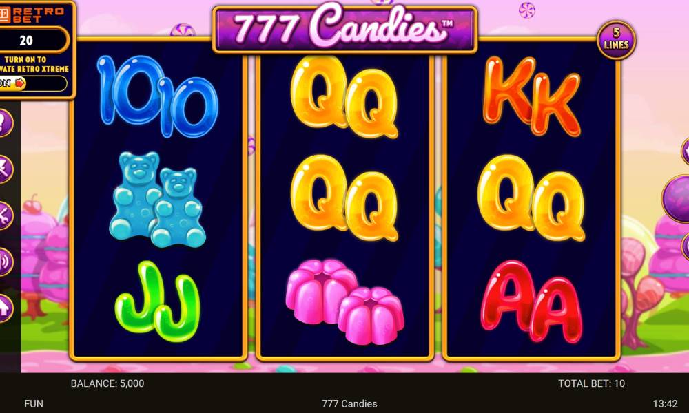 777 Candies slot features a classic playing field of 3 reels with a height of 3 cells, with 5 fixed paylines. Winning requires you to collect a combination of three identical symbols on one of them. The rewards in the pay table are very decent. The slot uses only 8 standard symbols and 1 special symbol. There are no free spins, and the bonuses are realized as an additional bet that increases the payouts for just one special symbol. The range of bets without activating Retro Bet Extreme varies from 0.05 to 50 euros. The medium level of volatility makes the slot suitable for players with different experience under their belt.