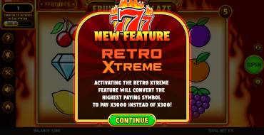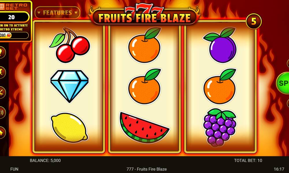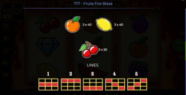 • Retro Bet. The only and very curious feature of the 777 slot machine is Fruits Fire Blaze. It allows you to double your bet from 50 to 100 euros. However, winnings from ordinary symbols will be calculated on the standard maximum value of 50 euros. What affects the increased bet is the 777 symbol, which becomes burning. A line of symbols will build a combination, bringing x3000, ie, 150000 euros.