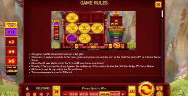 The 9 Lions Hold the Jackpot slot uses a non-standard layout - it is 3 reels of 3 cells each. The game lacks the usual paylines. The bet size can be set on the panel from 0.2 to 10,000 coins, and the maximum win is 750 bet multipliers. Winning combinations are formed only in the bonus rounds. Lions and coins activate bonus features, including Hold the Jackpot mode and a lion picking mini-game.