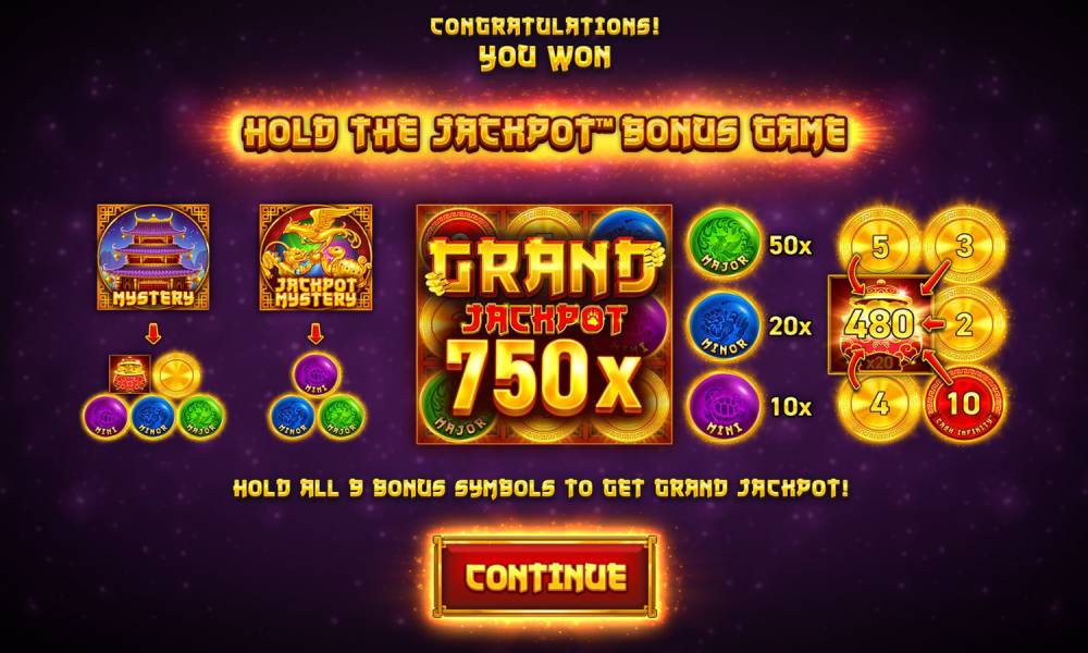 Hold the Jackpot - Activated by three bonus symbols in the center positions. The bonus game features sticky symbols and respins with the possibility of multipliers and jackpots.