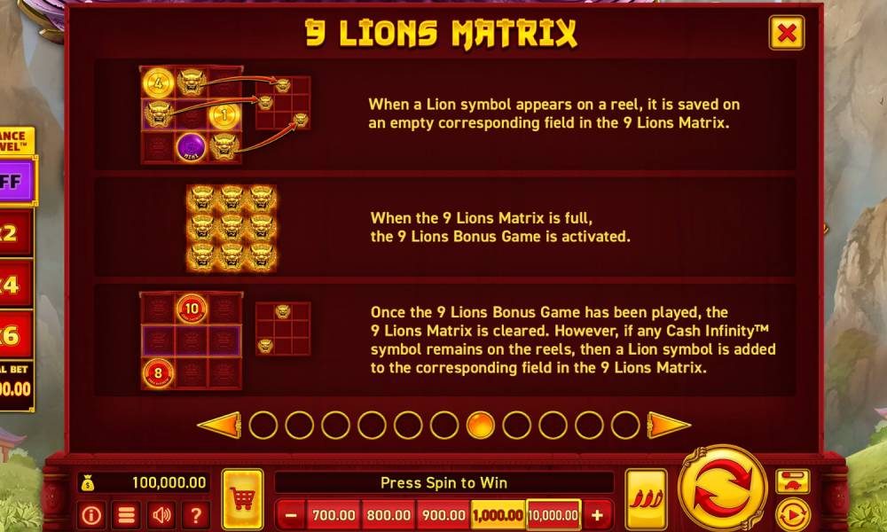 Lion Symbols - golden lions collected on the mini grid on the right trigger the 9 Lions bonus game.