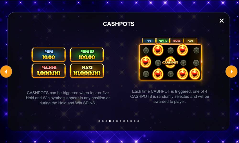 The jackpot is awarded when the Cashpot symbol falls during the Hold and Win Spins round or along with 4-5 other fireballs in the base game. The symbol immediately pulls up a random prize and it is paid out according to the rules of the game.
