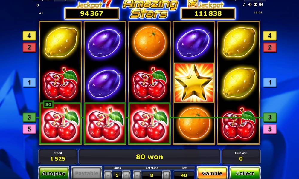 A new free online slot machine named «Amazing Stars» is another model developed by Novomatic company, which developed fruit and berries topic. It makes difference to a plenty of other similar video slots developed under this brand by its extremely colorful and realistic graphics, an unusual Scatter symbol and two progressive jackpots. All the particularities of the interface and the gameplay of this model are carefully described in the following article prepared by the reviewers of casinoz.me.