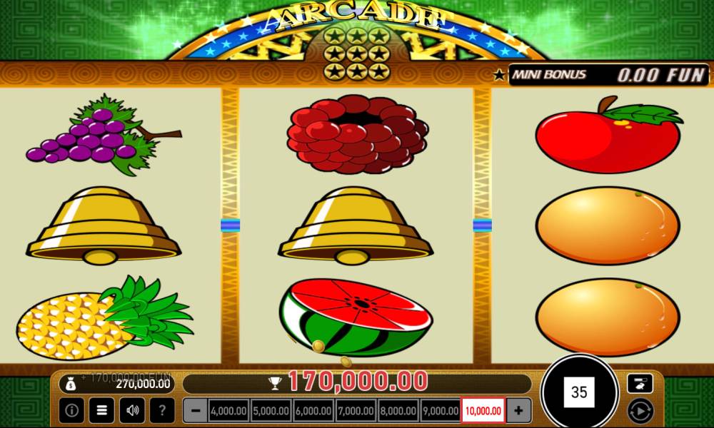 The Arcade slot is a classic online slot with three reels and one payline. Winning combinations are formed when coincidence of three identical symbols on the line, starting with the first reel. The range of bets varies from 0.2 coins to 10000 coins per spin that allows players to choose a comfortable level of risk. The maximum winnings is 409x the bet amount. The slot also features a risk game, where after any winnings, the player can double the amount by guessing the color of the card.