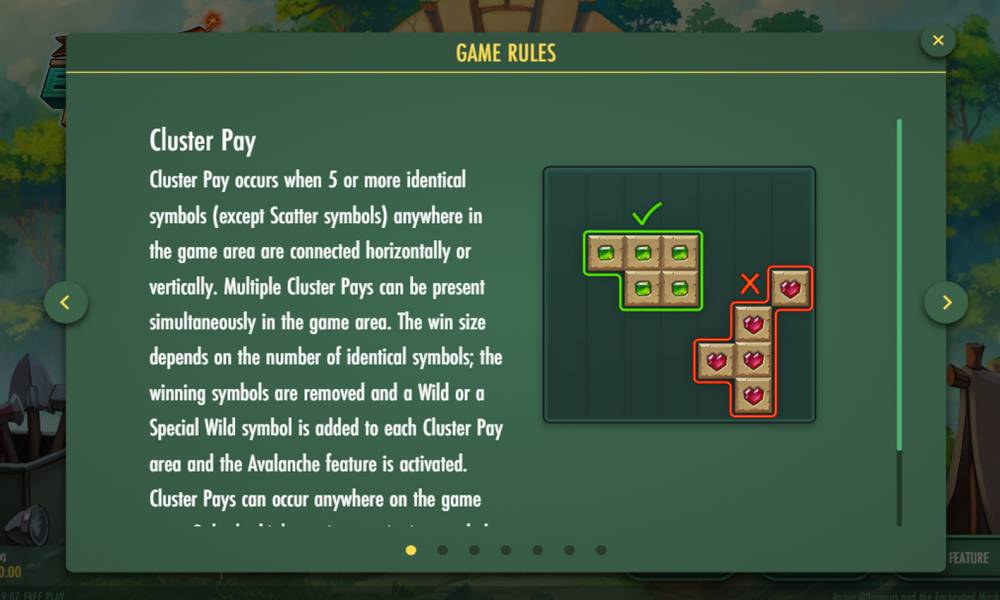 Archie O'Loggins and the Enchanted Masks video slot has 7 reels in 7 rows and a cluster pay system. To win, you need 5 or more symbols of the same name (not counting Scatter) to be connected vertically or horizontally anywhere on the playing field. Several winning combinations are possible in one round. The Cluster Pay area is removed, the Wild or Special Wild symbol appears and the Avalanche feature is activated, in which new symbols fall in place of the disappeared symbols. The more the more the more identical symbols are removed, the bigger the winnings. For each combination of symbols there is a multiplier to the bet, the sizes of multipliers are specified in the payout table. Maximum multiplication x300 to the bet gives a simultaneous fallout on the reels of 40 symbols Wild or Archie Explorer. Betting range - from 0.1 to 100 euros.