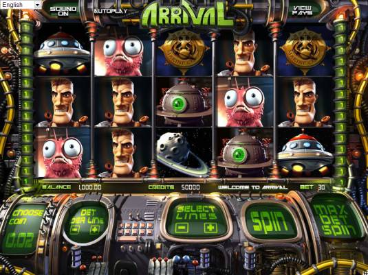 Arrival is an excellent slot machine developed by Betsoft gaming company. It is provided with some innovational features, which promise you unforgettable game! Everything reminds about literature, which we have read about this topic, in this video slot. Fantastic aliens are definitely clever and the main character is not exception here. He controls the reels as if he was driving a space ship, giving orders. Among the gaming symbols of this model, you would see images of sea soldiers, a girl-scientist, alien pets, beam weapons and lots of other items at the screen. However, it is far not all that this slot machine can offer you. There are also three Scatter symbols, which trigger different bonus games, some of which include free spins, many payoffs and other surprises.