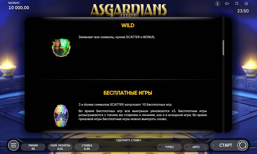 The Asgardians Dice slot machine from the Endorphina provider has a standard 5x3 playing field with 25 pay lines.