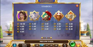 The interface in the Athena Ascending is extremely simple. The center is given to the playing field without any additional functionality. Underneath it is the control panel, containing all the constantly necessary buttons. Here is located "i" to call the help menu, preset values of the bet per round and "Auto" with "Spin" for automatic or manual start of spins.
