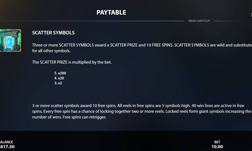 Atlantis Gold, prefer only verified online casinos. Such casinos guarantee fair payouts, transparent terms and conditions and reliable protection of your data. Play where you are safe and confident in every bet!