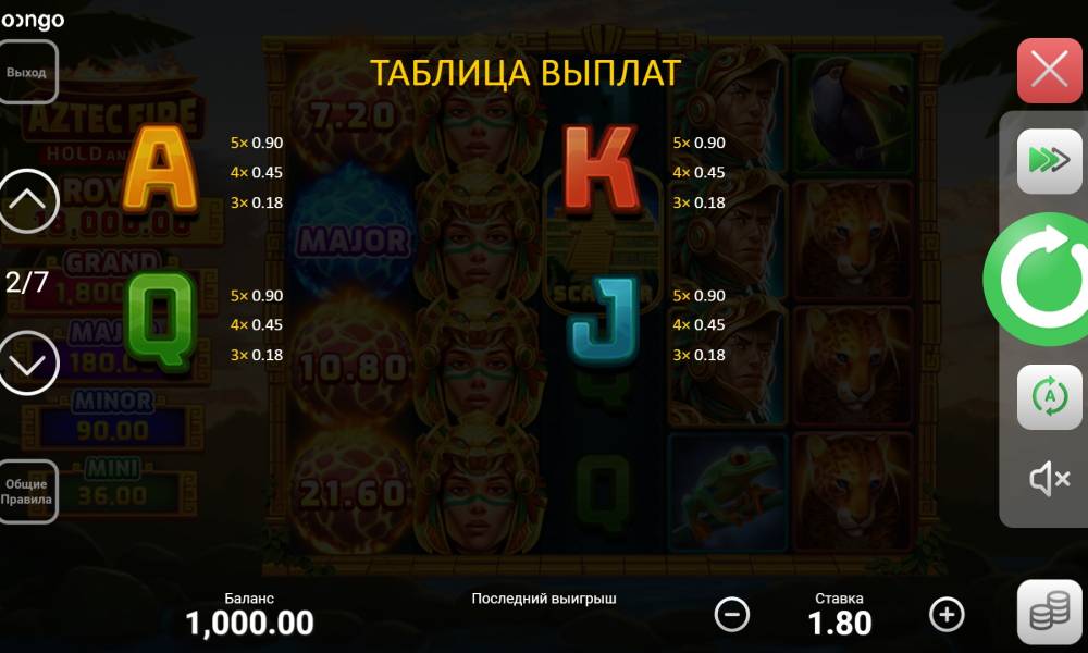 The interface in Aztec Fire: Hold And Win is convenient and intuitive. The lower part of the control panel is responsible for the size of bets and provides information about wins with the balance status. On the left is the jackpot table, and the playing field occupies the traditional center of the screen. On the right side there are buttons to start spins, help menu and mute.