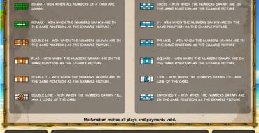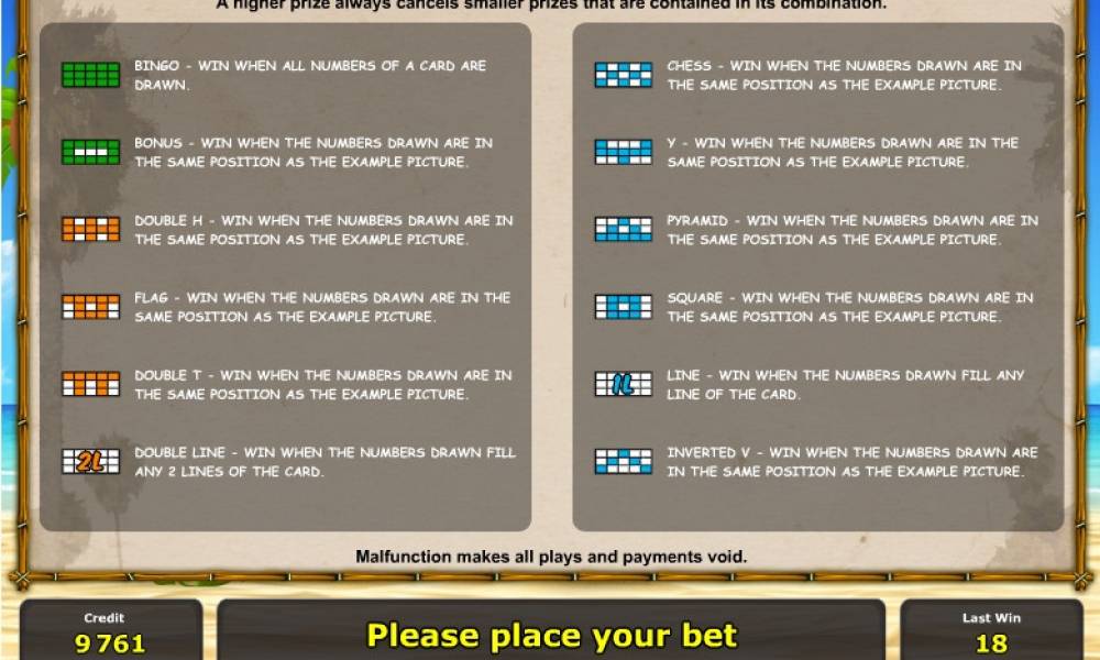 There is no need to describe all interface features, since the model is fully translated into several languages, including all the inscriptions on the control panel, data on the rules, information about the game, and all dialog boxes. The main part of the screen is occupied by playing cards. Balls involved in a given round appear from the left side. A seascape with palm trees on a sandy beach serves as a background. Users may notice information about all paid patterns and the current size of progressive jackpot at the top. There are some intuitively understandable buttons on the control panel, which are used to select the number of cards and bet sizes. They also allow buying an extra ball, activating automatic mode, and open the rules. The section with information that can be open by clicking on the button Help allows finding more data on some aspects of gameplay. Users can adjust audio effects, select the game window size, or expand it to full screen in the options. There is no need to download Beach Party Bingo. This model can be run on websites of casinos directly in the browser.