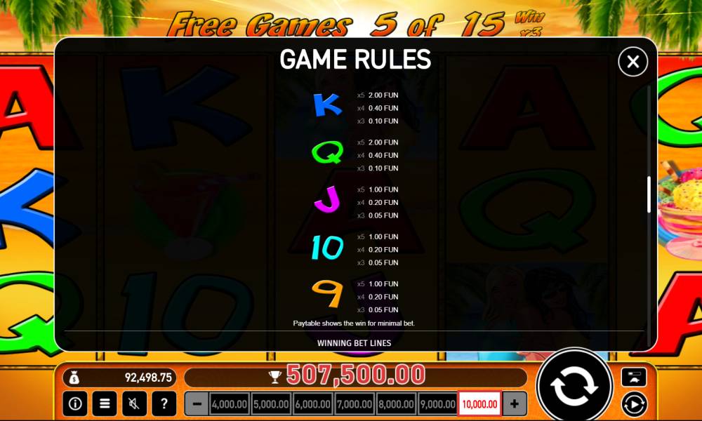 Online slot Beach Party from Wazdan is a classic slot machine with 5 reels and 3 rows of symbols. The game provides 10 fixed win lines, which are active on each spin. Winning combinations are formed from left to right, starting from the first reel, and must include a minimum of three identical symbols on the active line. The betting range varies from 0.2 coins to 10,000 coins per spin reels, which makes the slot accessible to both beginners and experienced players.