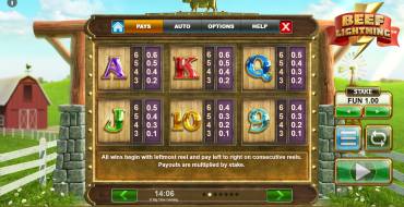 The Beef Lightning Megaways slot machine from the provider Big Time Gaming has a field with 6 reels, the number of symbols in which is random and determined by the mechanics of Megaways. The number of game lines can be up to 117649 pieces.