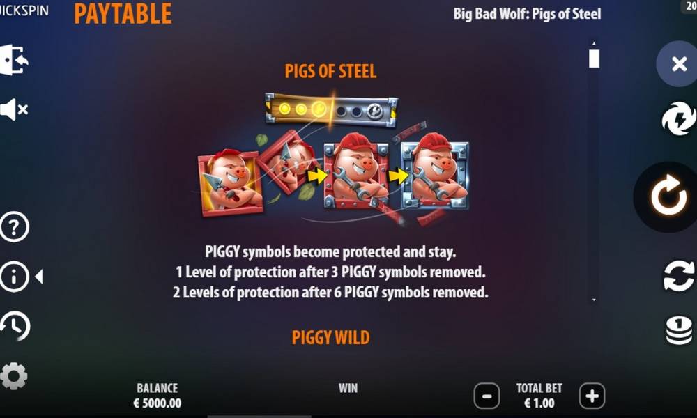 The game Big Bad Wolf: Pigs of Steel comes on 5 reels in 3 rows with 25 fixed paylines. The bets range from 0.2-100 euros. The main features of the slot include cascades, reinforcing symbols with Pigs of Steel piglets with 2 levels of protection and turning piglets into Piggy Wild, which will require 2, 4 or 6 consecutive cascades. Winning combinations are formed from identical symbols appearing in a row on adjacent reels in the left to right direction. In addition, each symbol when 3 or more fall out allows you to apply a multiplier to your bet, specific multiplier sizes are shown in the payout table. The total maximum winnings can reach x18,000 of the bet!