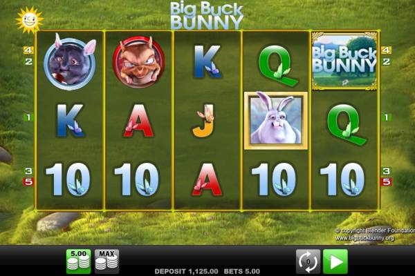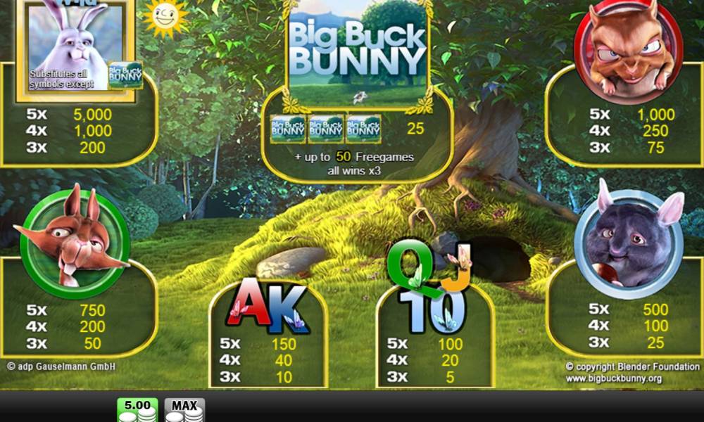 Scatter (a logo of «Big Buck Bunny») drops out at the first, third and fifth reels. Three Scatters bring a payoff in amount of five total bets and trigger free spins.