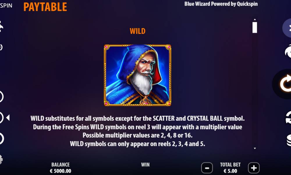 Wild symbol is depicted as the Blue Wizard. In the main game, it appears on all reels except the 1st reel. It substitutes for any symbols except for Scatter and Crystal Ball. In the round of free spins, a wild symbol appearing on the 3rd reel has a multiplier with a value of 2, 4, 8 or 16.