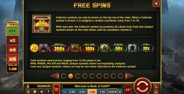 The Book of Faith has a Free Spins feature available, which is activated when you hit 3, 4 or 5 Scatter symbols on the field in the form of books. The free spins feature offers 10, 20 or 30 free spins. During the free spins, the expanding symbols cover the whole reel, so you can definitely collect quite a lot of prizes. Also within the free spins, you can dive into Collector Mechanics, where collecting Cash and Jackpot symbols is available for significant payouts.