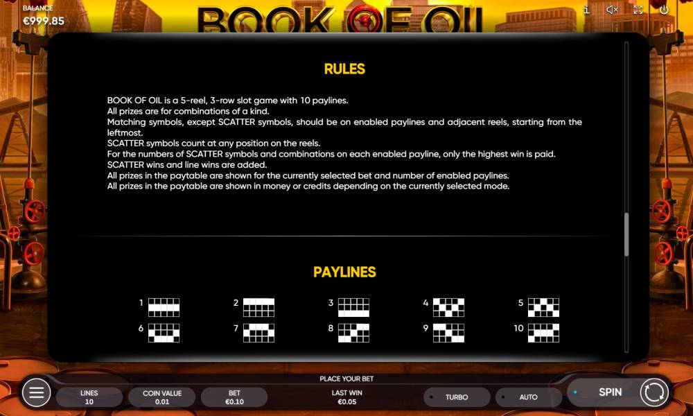 The Book of Oil slot machine from the Endorphina provider has a standard playing field, consisting of 5 reels with 3 symbols. All payouts are made on 10 pay lines.