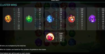 In the base game, the field has a 5x5 grid with no clearly delineated reels or cells. During free spins, it can expand to a size of 8x8. The payout mechanics is Cluster Pays, which involves making chains of 5 or more identical symbols connected horizontally and/or vertically. The game uses 3 types of junior and senior symbols, all of which are funny balloons. When a winning combination is formed, a cascade is triggered - the prize symbols leave the field, and new ones appear in their place. This continues as long as the paid chains. Bet on the spin can be made from 0.1 to 10 euros. Maximum winnings can not exceed the selected amount of more than 11000 times.