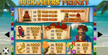 Buckaneers' Frenzy is a slot with 5 reels and 10 fixed paylines. To form a winning combination, you need to collect between 3 and 5 identical symbols starting from the leftmost reel. Symbols include traditional card denominations (A, K, Q, J, 10) and themed images such as a bottle of rum, orange, parrot, anchor and bags of booty. There are a total of 5 types of low and high paying symbols each. The parrot symbol is the most valuable and the only one of all brings a payout of 2 pieces per line. The game also has special signs that activate bonus features and free spins. Bet on the spin can be different amounts from 0.1 to 10 euros. Users can get large wins up to x50000 from the bet.