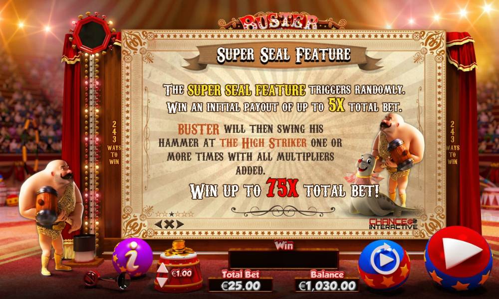 We believe all readers of Casinoz are familiar to the popular attraction which suggests everybody to measure their strength by hit of hammer by the anvil. It is exactly the entertainment which was lies in the base of the plot line of the new video slot named «Buster Hammer» developed by Chance Interactive company. The main character of this game in an athlete which shows his power at the circus arena and delights the gamblers by huge bonus payoffs. Please read about all main features of this model below.