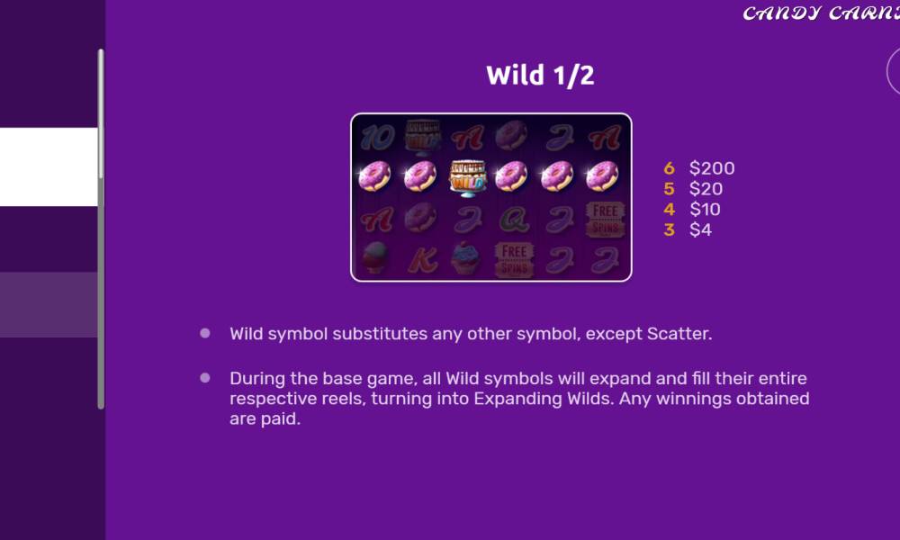 In the online slot Candy Carnival free spins are activated, when on the reels three to six Scatter symbols appear. The more Scatter symbols, the more free spins - from 10 to 50. During the free spins, Wild symbols become walking symbols, moving across the reels and creating new winning combinations. Free spins can be reactivated by getting additional Scatter symbols, increasing the chances of a big win.