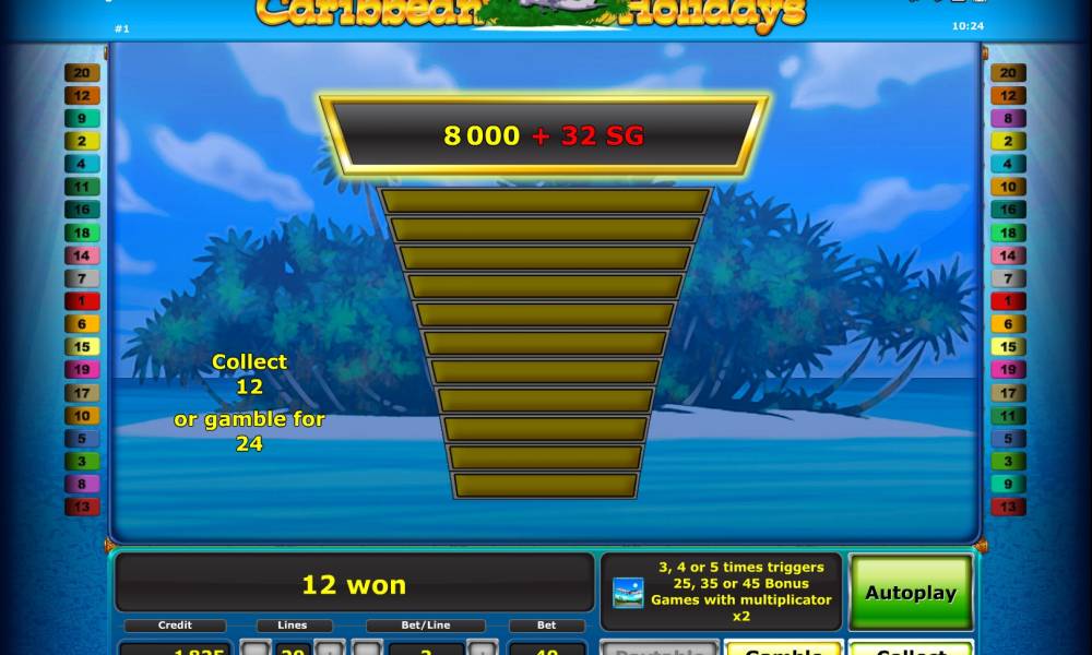 Almost all famous software producers in filed of online gambling offers online slot machines about vacations on the sea coast. Novomatic company doesn't stand aside of this theme and has released few models of this kind. One of them is «Caribbean Holidays» video slot, which has a nice design and several very attractive features of the gameplay. Please read about it in the following review by Casinoz.