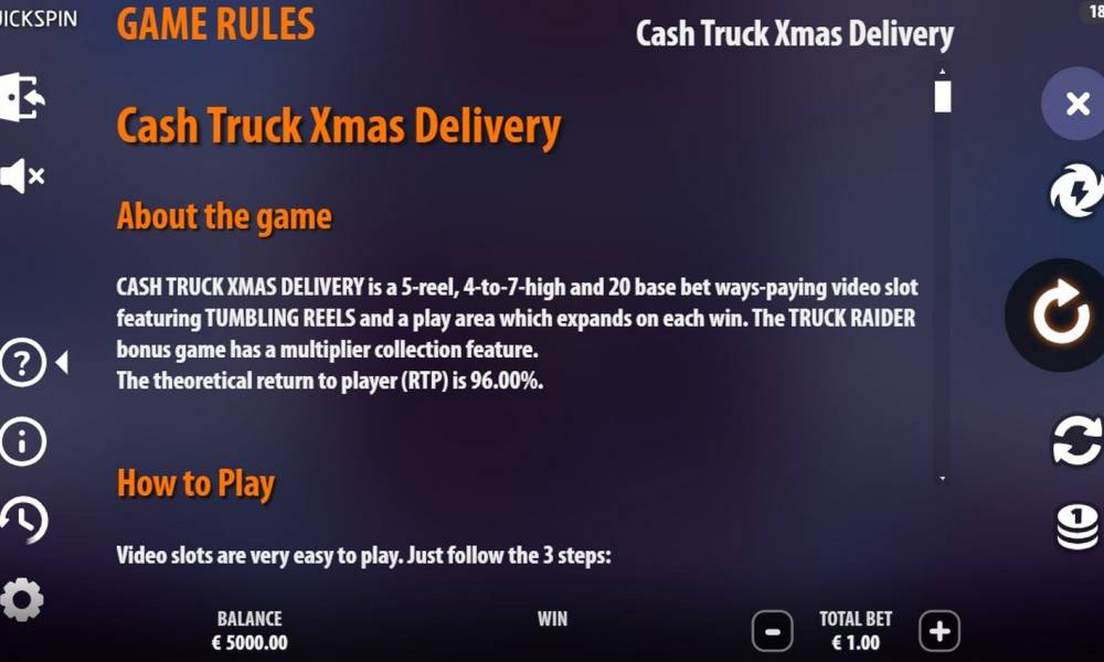 The developer made sure that playing the Cash Truck Xmas Delivery machine was convenient, and the interface is characterized by accessibility. As usual, the reels are located in the center of the screen, the control panel and help information are on the right, and the button to buy the bonus feature is on the left. Start the game with a few steps: