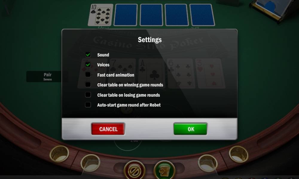 Casino Stud Poker requires a classic 52-card deck without jokers. The virtual dealer shuffles cards before each hand.
