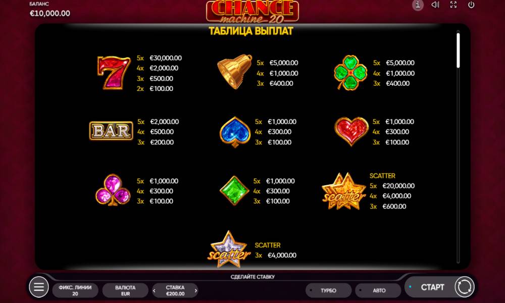 Slot Chance Machine 20 has a classic interface, characteristic of products brand Endorphina. Here everything is clear even to someone who is playing gambling for the first time: signed buttons, visual payout tables, textual support for each action. The player needs to perform a few steps:
