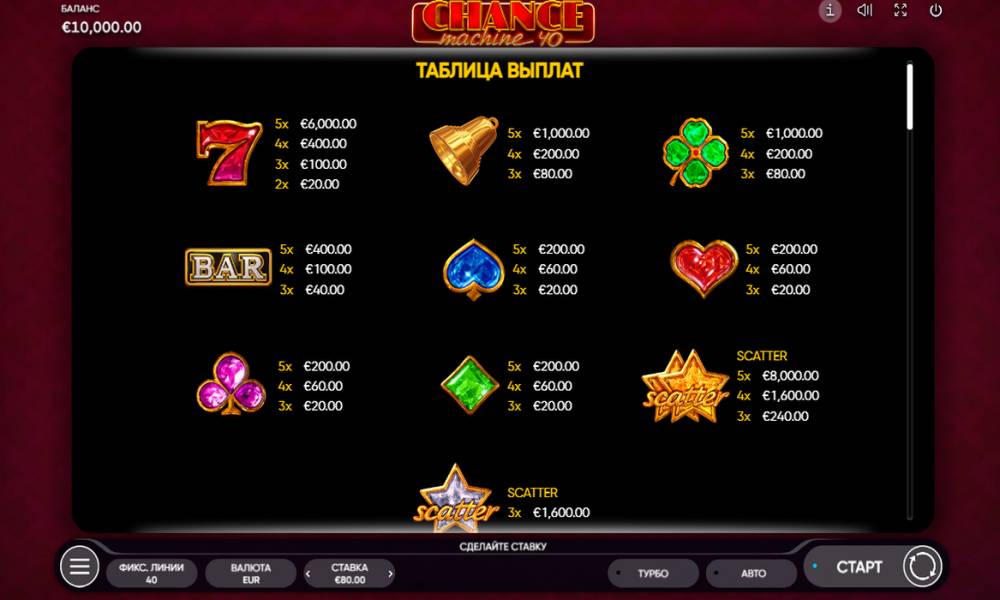 Those who love classic gambling games will not pass by the Chance Machine 40. The calm game with familiar symbols gives everyone a great chance to get big wins.