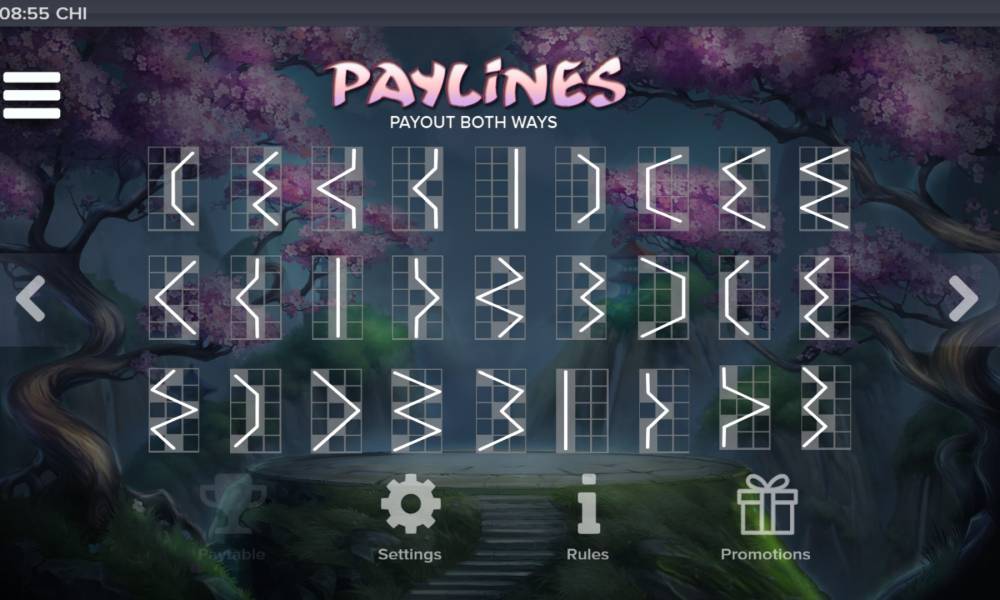 The Chi online slot machine has a unique design. Five reels are spinning in the horizontal plane. They look like if they are hanging on the vertical shaft under the roof of a Chinese garden house.