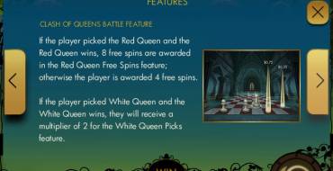 «Clash of Queens» offers the prize round which is triggered when one of the Queens drops at the first reel and the second - at the fifth. First of all, the player has to choose one of the parties by click at the crown of an appropriate color. Then the battle begins. The customer doesn't take direct participation in the battle, but follows its result. Depending on the Queen the player has staked on and the winner, the customer gets various rewards. He can win regular free spins, free spins with advanced features or a bonus game in style of «pick an item». This round consists of several levels. The gamblers passes to the following level when his Queen wins. Please check details in the informational section where all the rules of the bonus game are explained carefully.