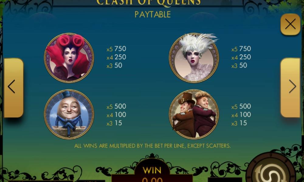 «Clash of Queens» is a five reeled online slot machine with fifteen symbols at the screen. It is possible to play by any number of active lines up to twenty five available. Bets per each of the lines are always equal. The slot accepts 0.01, 0.02, 0.05, 0.10, 0.20, 0.25, 0.50, 1, 2, 5 or 10 credits per each of the lines. This way, the total bet per spin can vary from one cent to two hundred fifty credits. This slot is provided with basic and social symbols, as well as a multi-level bonus game by the topic of the model, which can bring you payoffs or free spins. The standard symbols are paid when same icons are situated at the neighbor reels of the active line, starting from the first left reel necessarily. As usually, only the longest combination at each of the lines wins. An amount of the win is calculated by multiplying the bet per line by the index of formed combination (from x2 to x750). Exceptions from the rules are discussed below. The gambling feature is not provided. The theoretical payback index of «Clash of Queens» slot machine declared by the producer is 95,57%.