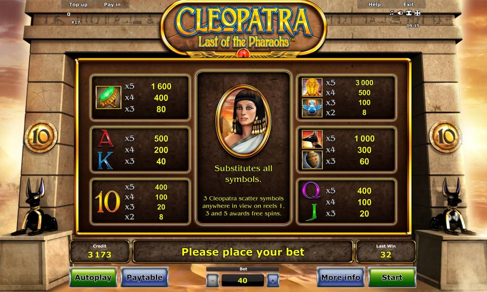 Another slot machine about Cleopatra is «Cleopatra: Last of the Pharaohs» which was presented by the developers of Novomatic company. We suppose it can interest you by its curious prize features and other advantages, which you can find out about from the following article prepared by the reviewers of the gambling dictionary - Casinoz.