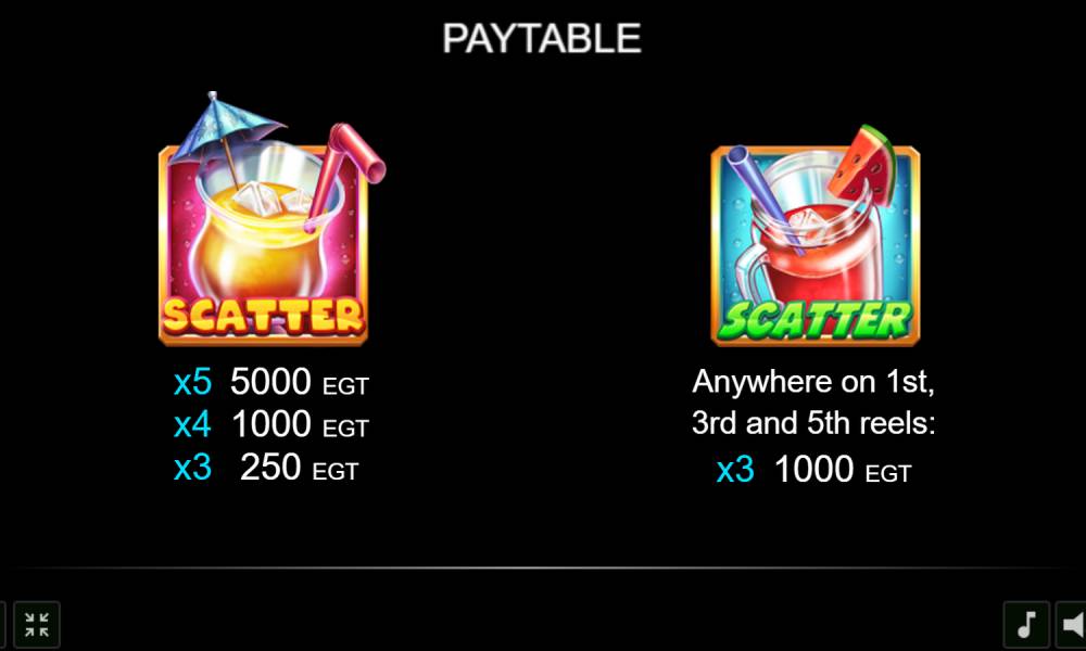 The Scatter symbol is a watermelon cocktail. It pays out when it appears on reels 1, 3 and 5 at the same time.