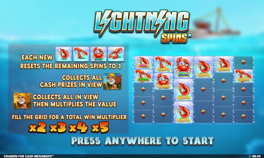 Lightning Spins. This is a famous chip of the provider, which is activated by the appearance of 6 or more cash shrimps, crabs and lobsters on the screen. If this happens, a field with stopped sea creatures appears in front of the player. The remaining cells rotate. Three respins are given. If the failure, the next turn, luck - the number of re-spins again returns to 3. In the end, all the money symbols (only they and freeze on the reels) are paid to the user.