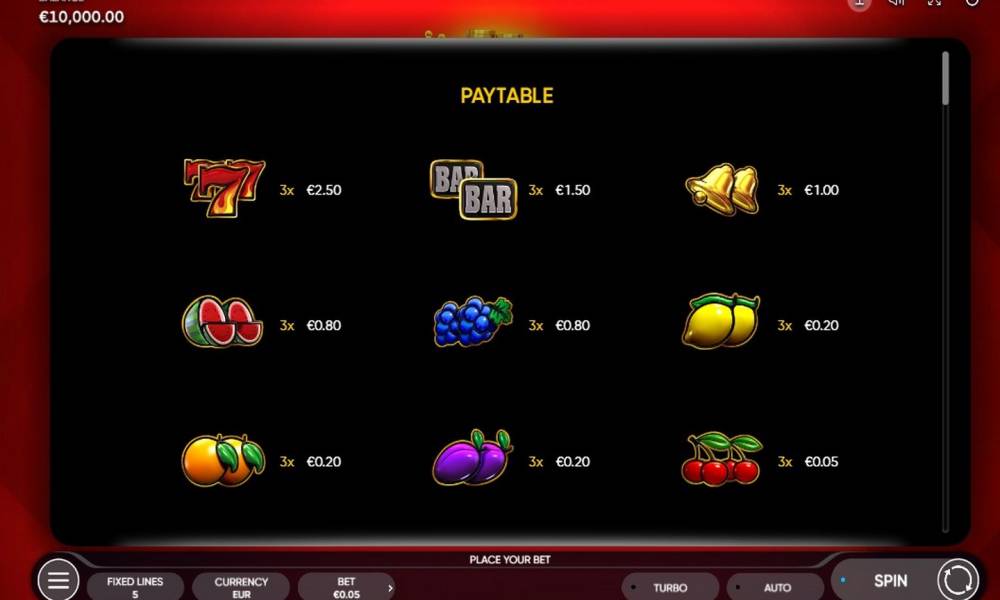 The Crown Coins video slot from Endorphina offers timeless classics in a modern treatment. Fruits, bars, bells and sevens stack in different combinations, creating winning combinations and triggering an interesting bonus game with big prizes. The game can shower you with gold coins and give you maximum winnings of x2,500 to the bet made!"