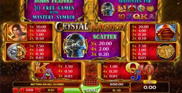 «Crystal Mystery» is a five reeled online slot machine with ten pay lines, which are always active on default, where paid combinations are formed at during the game. Bet per each of the lines have to be equal. The slot accepts 0.01, 0.02, 0.05, 0.10, 0.20, 0.50 or 1 dollar per each of them. This way, the betting range varies from ten cents to ten dollars per round. This game is provided with basic symbols, elements with special functions, a round of gaming feature, free spins under more beneficial conditions and a bonus prize round. The standard symbols are paid when several same icons drop out next to each other at the same active line making a solid chain from left to right. The combinations have to begin from the first left reel necessarily. As usually, only the longest chain at each of the lines is paid. An amount of the win is calculated by multiplying the bet per line by the index of formed combination (from x5 to x5000). In case of several combinations formed by results of the same round (at different lines), all payoffs are summarized. By the end of any winning spin you can play in the game of chance to double up your payoff. Everything is simple here: you need to guess a color of the face-down card. If you are lucky, your win is doubled up. If not, you lose the bet. It is also possible to play several times running. Unfortunately, we didn't find any information about payback index of «Crystal Mystery» slot machine. All exceptions are discussed below.
